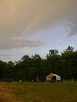 Farming, like many other jobs, is hard work. Like my previous job, I love it, but some days I am tired and wish that substitute would arrive. Yesterday was one of those days -- a rainy Sunday after some busy, busy weeks. After an afternoon of lunch out (Skinny Pancake, a great crepe restaurant in Montpelier using lots of local food - sorry for the sidebar) and errands, we returned home to pouring rain, wondering...do our animals really need to be fed and milked tonight? Ok, that was just a rhetorical question. Maybe the real question was, where is the Sunday evening chore elf, so we could be lazy?But no chore elf, so off to the fields we went. Mari, so kind, slogged to the fields in the pouring rain, while I milked. But as I sat there with Scrabble on the milking stand, I looked out to see an amazing rainbow. I thought to myself, really, this is quite lovely. A rainy evening, the sound of milk hitting the pail, a happy goat next to me and an amazing rainbow. So peaceful. As I walked her back to the barn, I looked north towards Paine Mountain. The clouds were just like a painting. In that moment, there were few better places to be than walking on our farm with Mari and our animals.